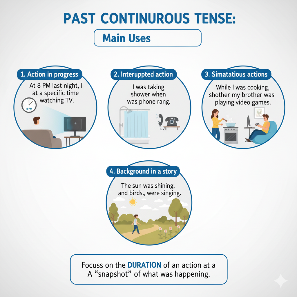 Understanding the structure is only half the battle. The true mastery of the Past Continuous tense lies in knowing when and why to use it. This tense has several distinct functions that bring clarity and context to past events. While these functions may seem separate, they all stem from a single main purpose: to provide the background context or temporal frame for past events. Instead of memorizing disparate rules, understanding this unifying principle allows for a more intuitive grasp of the tense.