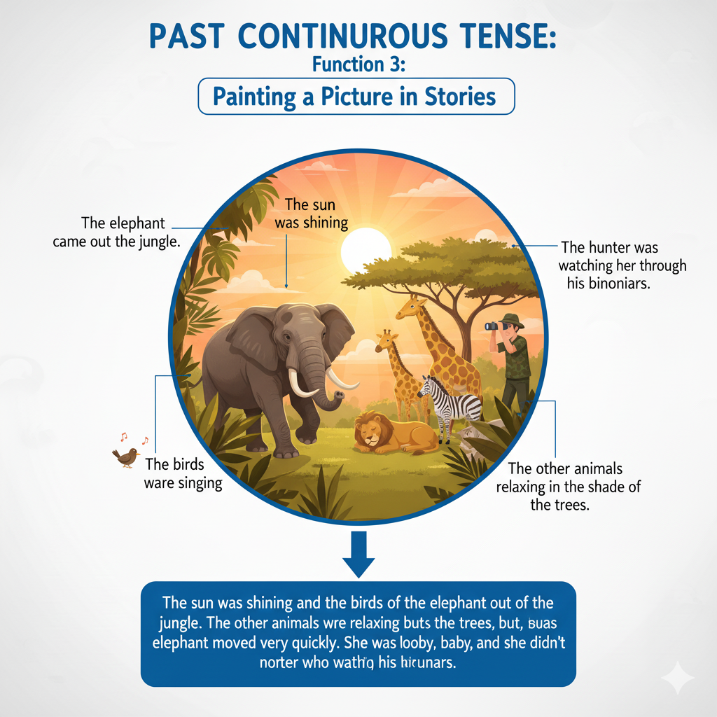 In this the Past Continuous doesn’t just list events; it paints a picture. It freezes a single moment in time (7:00 PM) and describes all the actions that were in progress within that frame. This “snapshot” ability is what makes the tense so powerful for setting the scene in storytelling and providing context for other events, a concept we will explore in depth later. This visualization helps clarify why the tense is fundamentally about providing a background against which other, often shorter, actions occur.