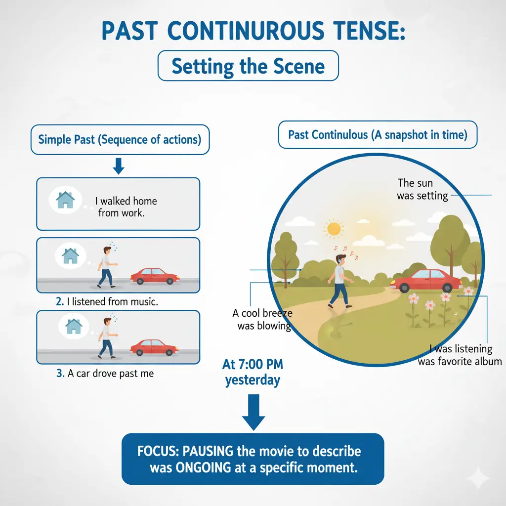 In this the Past Continuous doesn’t just list events; it paints a picture. It freezes a single moment in time (7:00 PM) and describes all the actions that were in progress within that frame. This “snapshot” ability is what makes the tense so powerful for setting the scene in storytelling and providing context for other events, a concept we will explore in depth later. This visualization helps clarify why the tense is fundamentally about providing a background against which other, often shorter, actions occur.