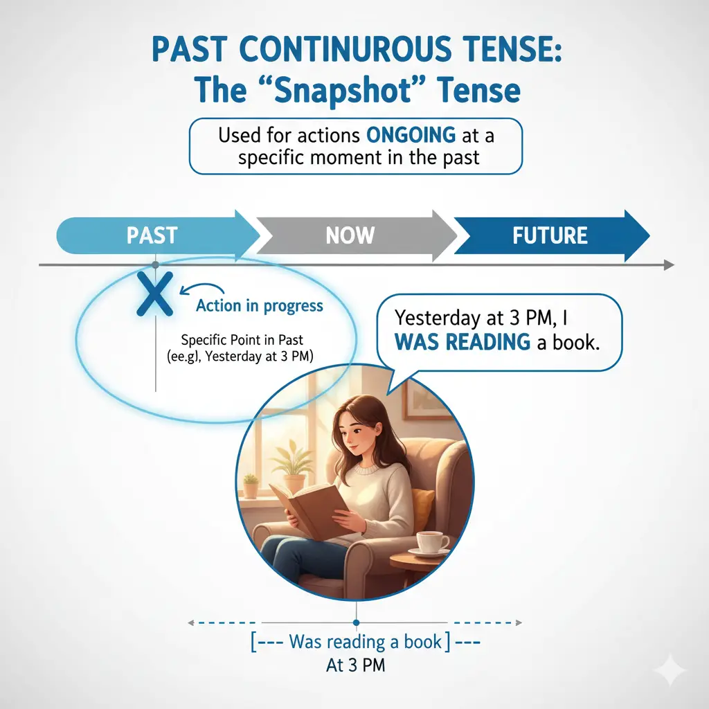 The Past Continuous Tense (also known as the Past Progressive Tense) is used to describe an action that was ongoing or in progress at a specific point in the past. It essentially tells us what someone was doing at a particular past moment or over a period in the past.